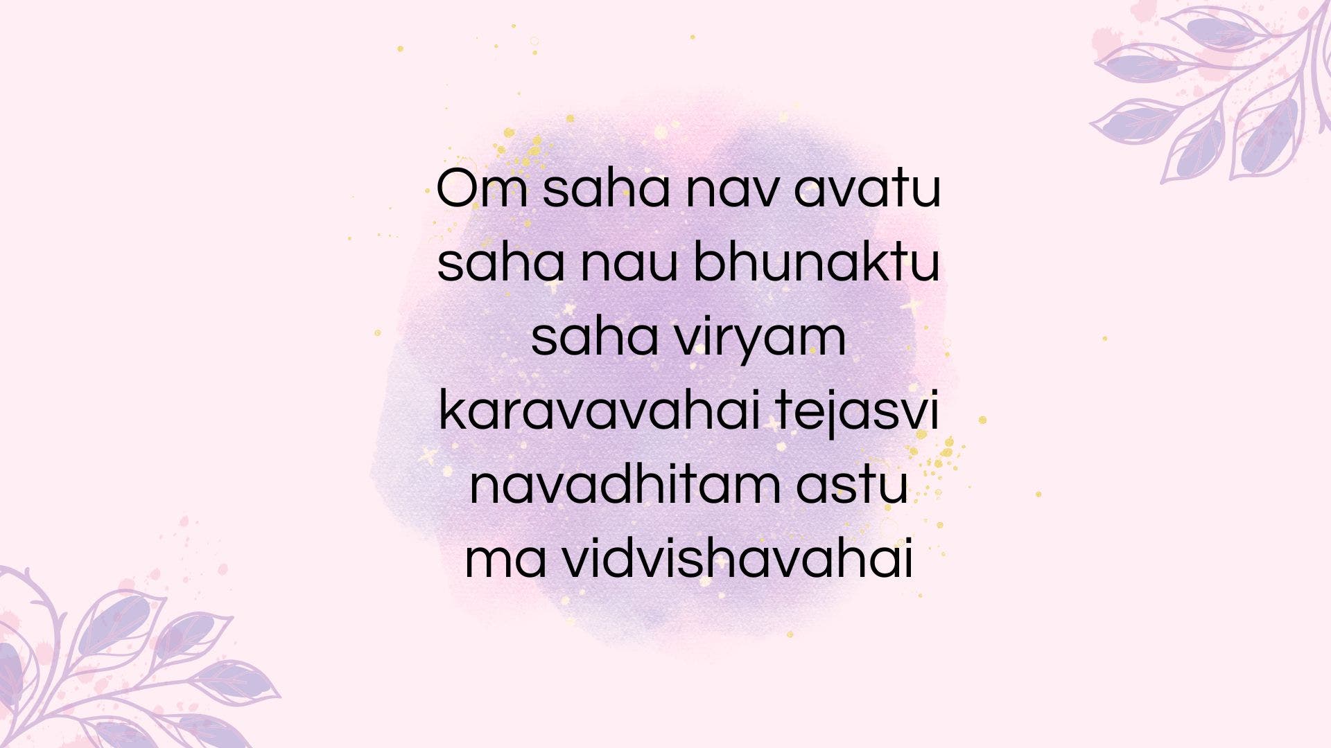 Pronunciation: Om saha nav avatu | saha nau bhunaktu | saha viryam karavavahai | tejasvi navadhitam astu ma vidvishavahai | Om shanti shanti shanti
