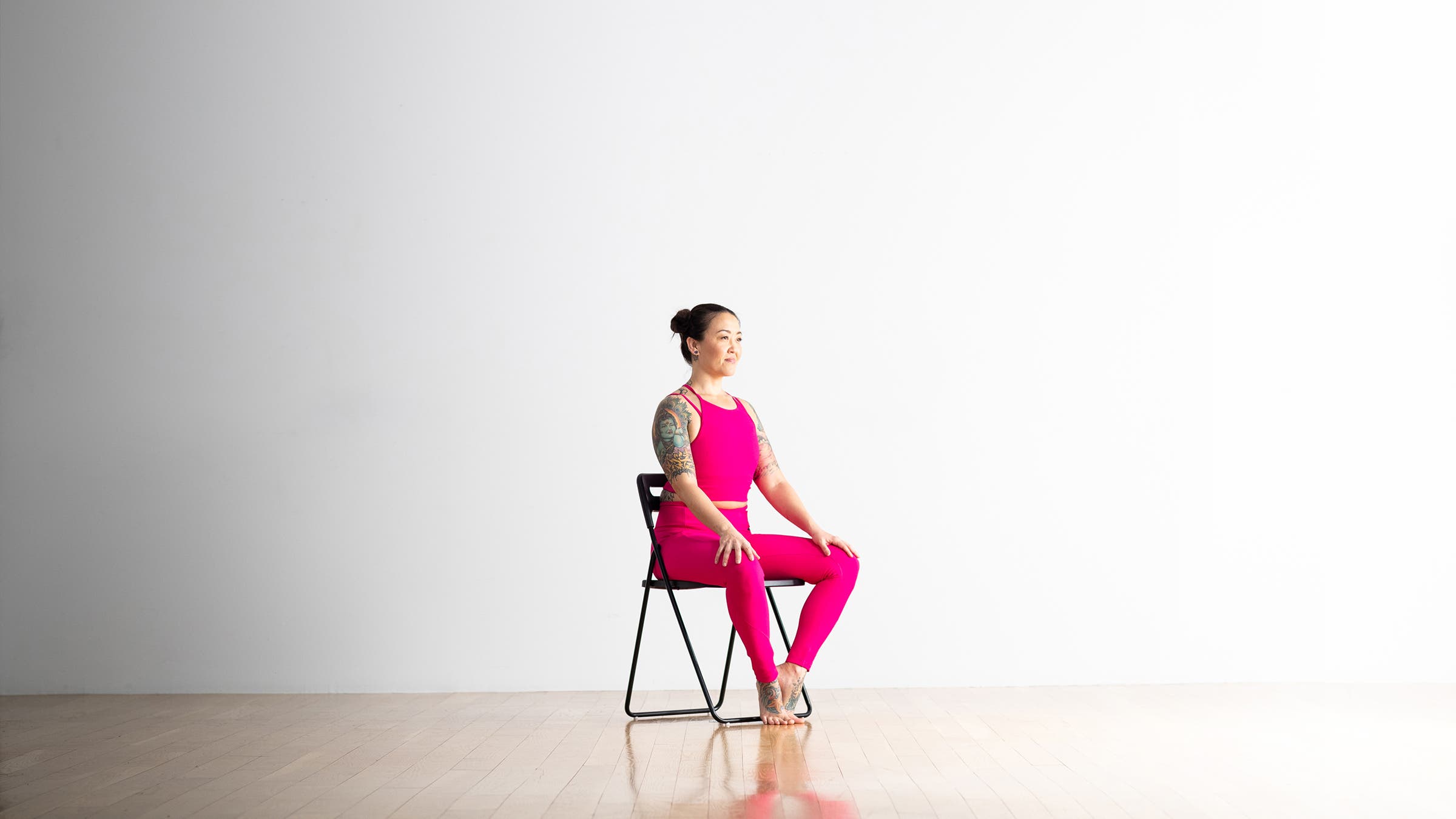 Chair yoga is exactly what it sounds like—yoga poses modified for a seated position. Although it originated as a practice for anyone experiencing limited mobility, anyone can practice yoga in a chair to stretch stiff muscles and fascia, experience relief from aches and pain related to prolonged sitting, regain proper posture, improve blood flow, and draw awareness to the breath, which can promote a sense of calm.